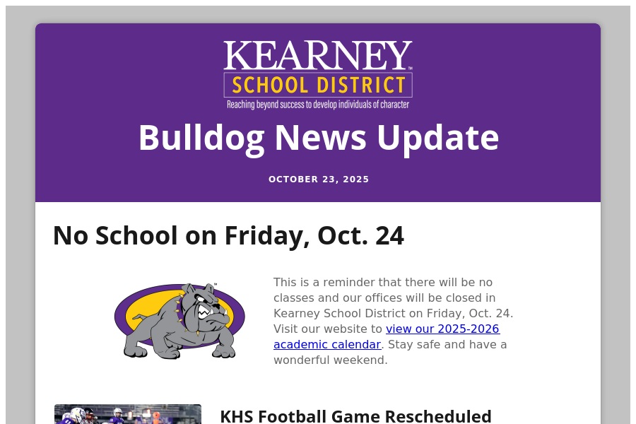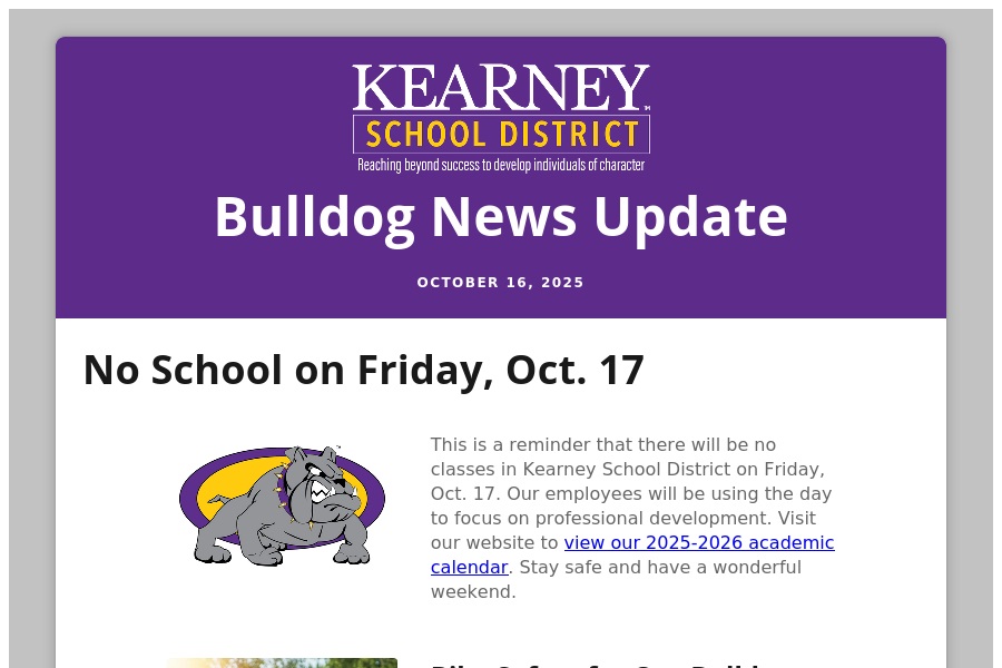 Bulldog News Update October 16, 2025 No School on Friday, Oct. 17 This is a reminder that there will be no classes in Kearney School District on Frid. . .